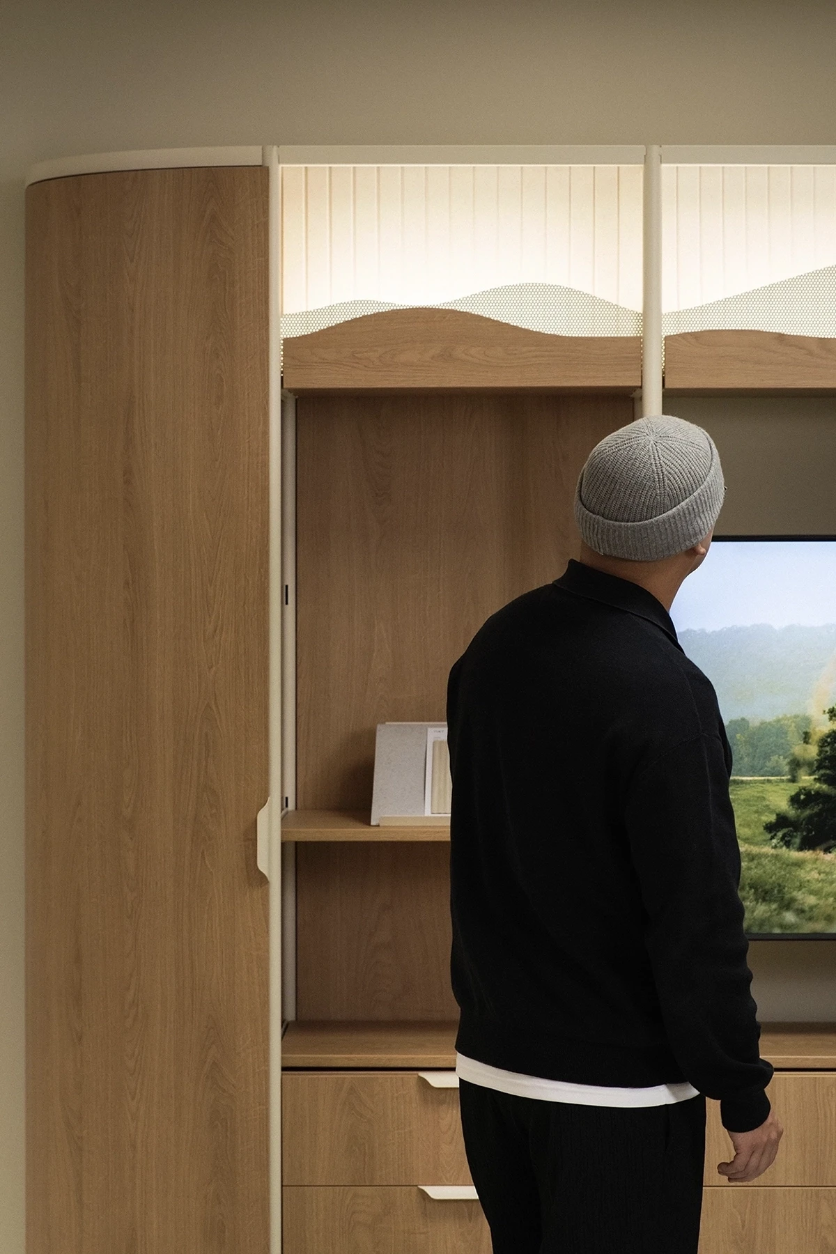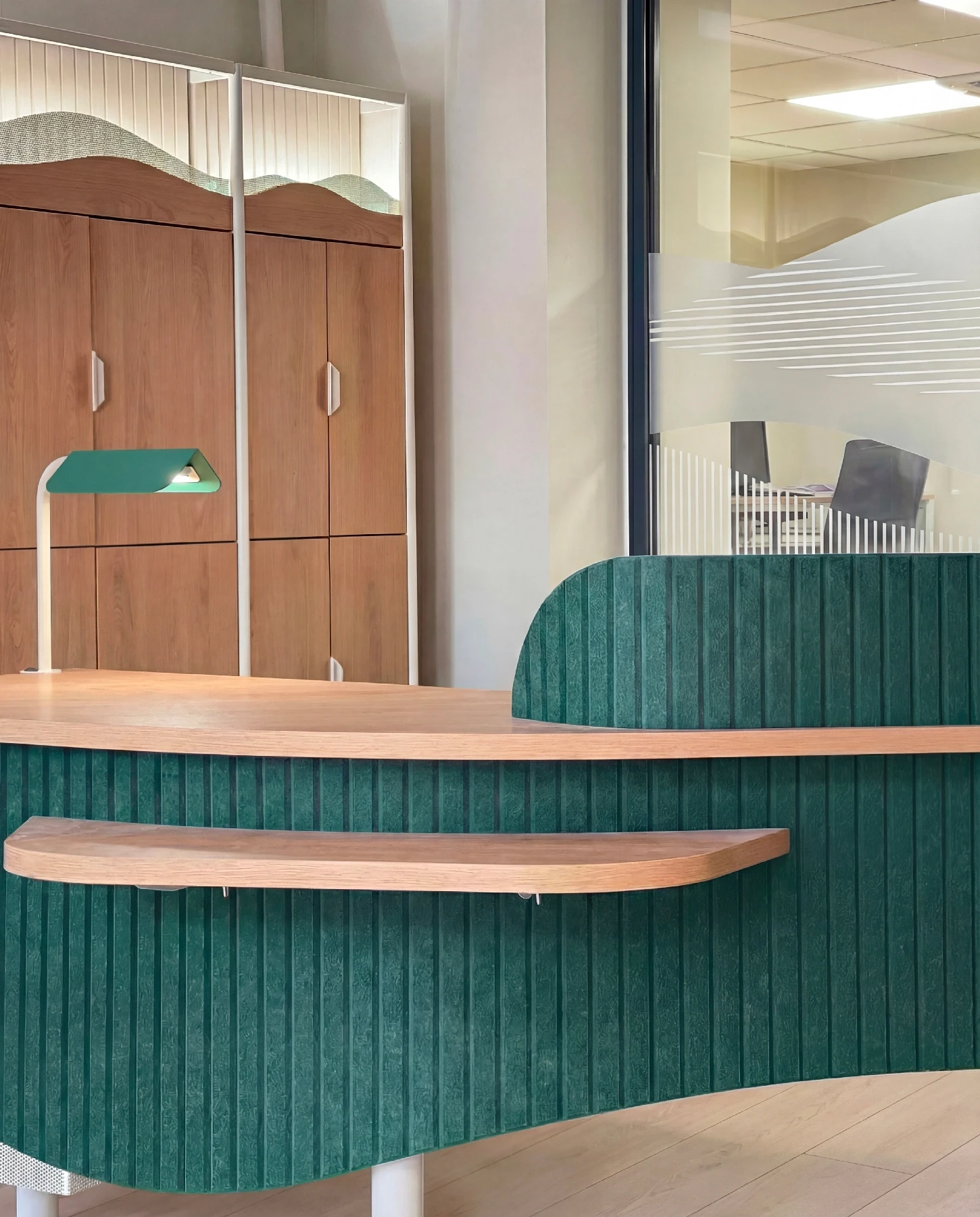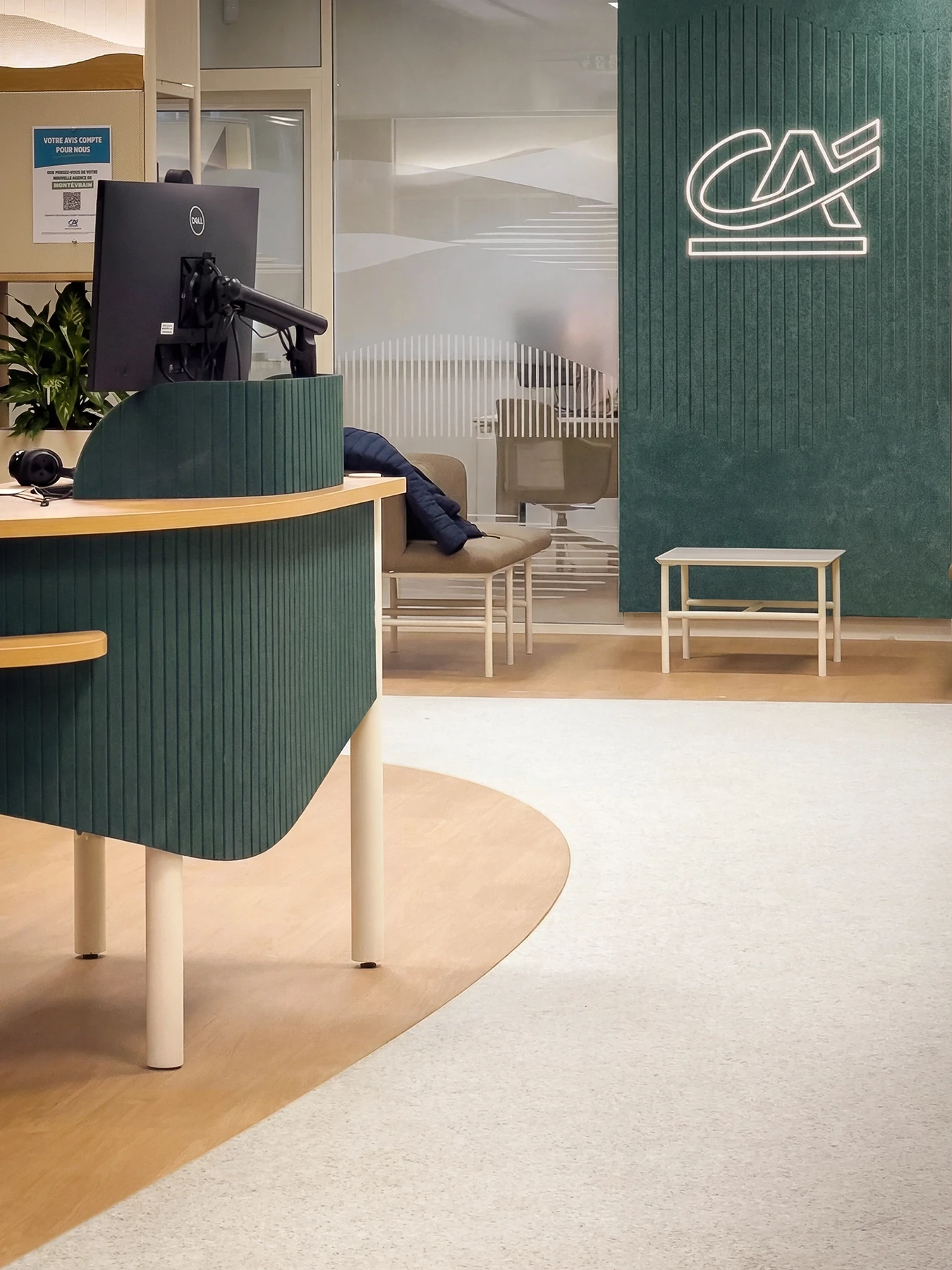 DESIGN SYSTÉMIQUE & MODULAIRE Révéler l’utilité de la banque, aujourd’hui comme demain, c’est être capable de concevoir un nouveau système d’aménagement agile et adaptable. Les modules constituent l’agence. Ils s’assemblent, se déplacent, se reconfigurent selon les usages et les contextes territoriaux. L’accueil se décline en 3 formats en fonction de l’agence et de son flux de clients. Les modules hauts rythment les parcours, permettent de cloisonner les espaces pour s’adapter à différentes expériences d’accueil, de formations et de conseils.