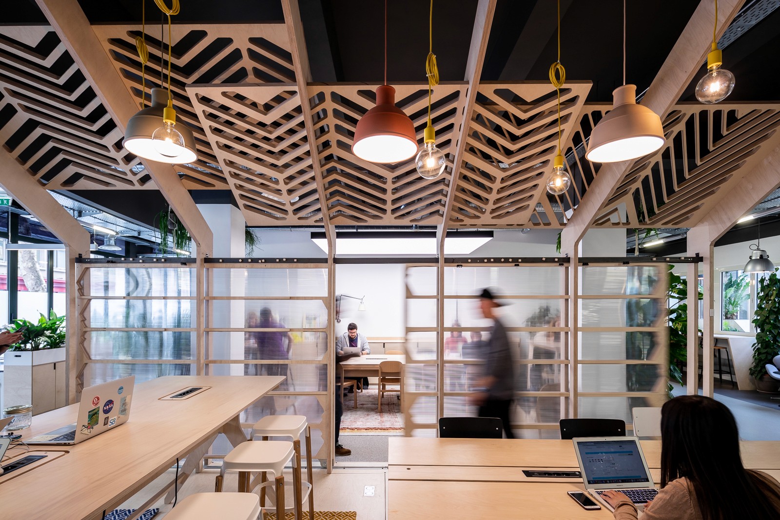 Les parois légères en polycarbonate sur rails permettent de fermer l'espace pour préserver l'intimité des discussions tout en laissant la lumière circuler. La grande table traverse l’espace et prolonge le plateau de travail, permettant de passer d’un temps de focus à une réunion d’équipe sans changer de lieu. Au-dessus, le plafond ajouré dessine un motif graphique fort tout en gardant la structure visuellement légère.