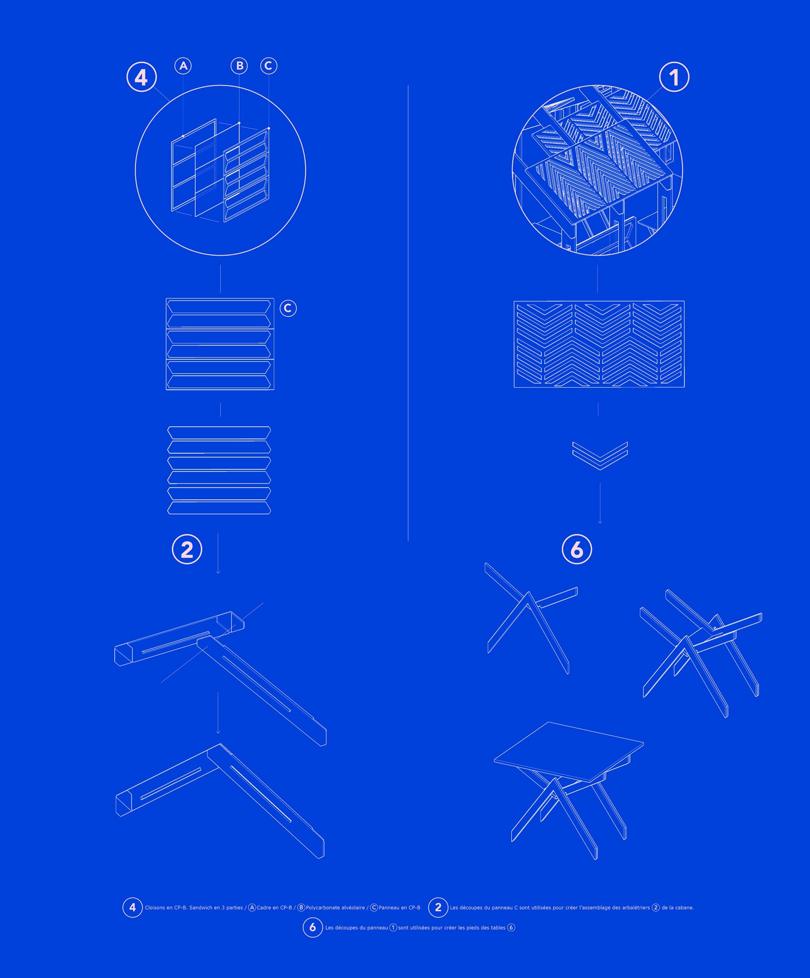 Dans une démarche de conception responsable, les cabanes ont été dessinées pour limiter au maximum les chutes de bois : mêmes épaisseurs, modules répétés, découpes optimisées. Les pièces restantes ne sont pas jetées mais réemployées pour fabriquer des tables et certains éléments de mobilier. La structure et l’ameublement font ainsi partie d’un même système, qui réduit la mise au rebut des chutes de matière tout en renforçant la cohérence esthétique du projet.