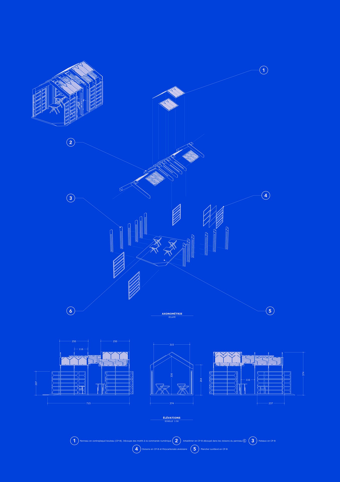 Un travail collaboratif avec le Collectif Quatorze pour construire ces deux architectures qui viennent structurer et animer l'espace. Résultat : Un geste design au service du collectif. Inspirées des techniques d'assemblages japonais : ces deux cabanes sont faites de pièces de bois qui s’emboîtent sans colle ni vis : une structure solide, à l’impact maîtrisé dans une approche zéro déchet, rapide à monter et à démonter, dont c'est inspirée le Collectif Quatorze pour réaliser des tiny houses solidaires. Conception Design : Fred Ly / Collectif quatorze Réalisation et installation : Collectif quatorze