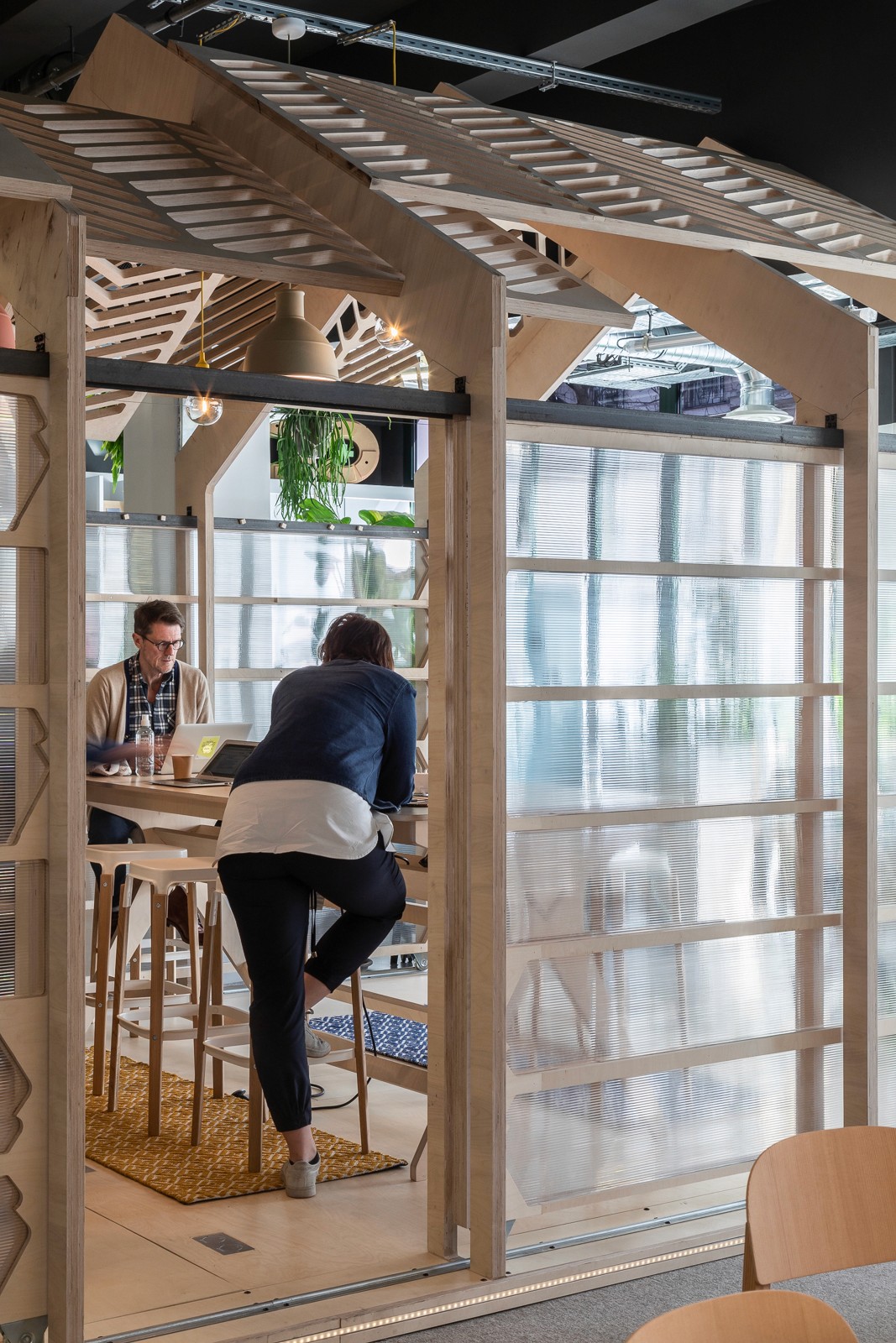 Au cœur du plateau, la cabane devient le repère autour duquel s’organise tout l’open space. Cette micro-architecture en bois structure le flux : grande table de projet au centre, postes partagés, zones plus calmes en façade et espaces informels près des circulations. La cabane fonctionne comme un noyau vivant – lieu de réunion, atelier et signal visuel – qui donne une échelle plus chaleureuse au vaste volume de bureaux.
