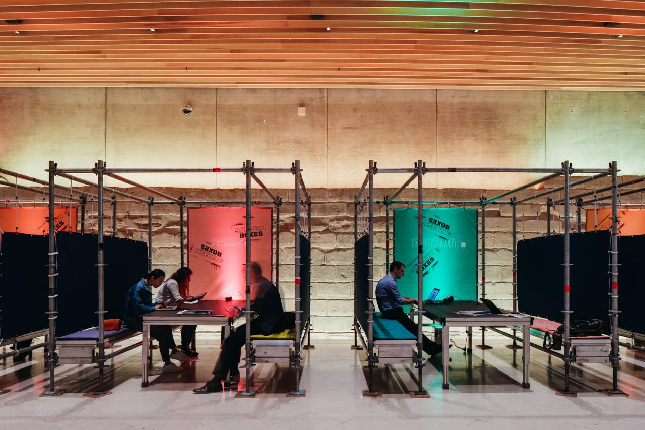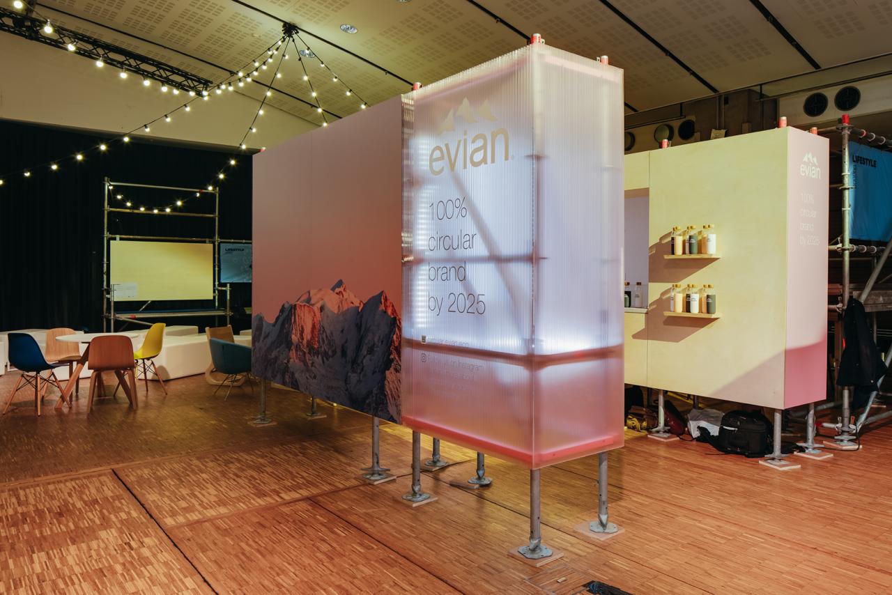 Chaque îlot est construit à partir d’un même langage : une ossature d’échafaudage standard, habillée de panneaux bois, assises et toiles en PET recyclables. Ce système modulable permet de composer librement stands, espaces de workshop ou zones de pause, en fonction des besoins du programme. Entièrement démontables et réutilisables, ces structures réduisent l’impact matériel de l’événement tout en affirmant une esthétique brute, assumée, en phase avec les enjeux de Sustainable Brands.
